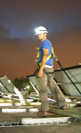 Work is in full swing on the Georgia Tech Solar Decathlon entry, with students on the job 24 hours daily until Friday. Witness the night owls that materialize each midnight, seduced into action by the lunar tides and the lure of the prize ($0), forsaking free meals (or even food), sleep, sex, handshakes, and any chance to learn foreign cuss words from Team Spain. The solar panels are in place. One dead or dying; thanks muchly for the spare.