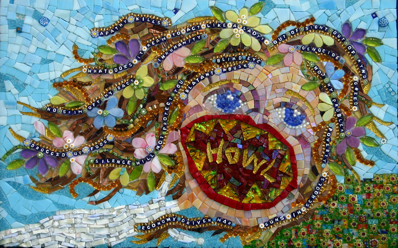 Okay, random things first. In between my too-many pursuits, I finally finished Howl, my mosaic protest piece, just in time for the opening of The War Against Peace Exhibition at Ciel Gallery. I chose to work this piece in a folk-art style, because it is so often the “child” within us that reacts most instinctively to the atrocities around us. The image depicts a Peace Angel howling in anguish over the current state of Man and Earth. Alphabet Millefiori spell out her howls as she flies over the land surveying our lives below. This piece uses vitreous, smalti, millefiori, glass beads, and shell. Click on the image to enlarge and read the messages.