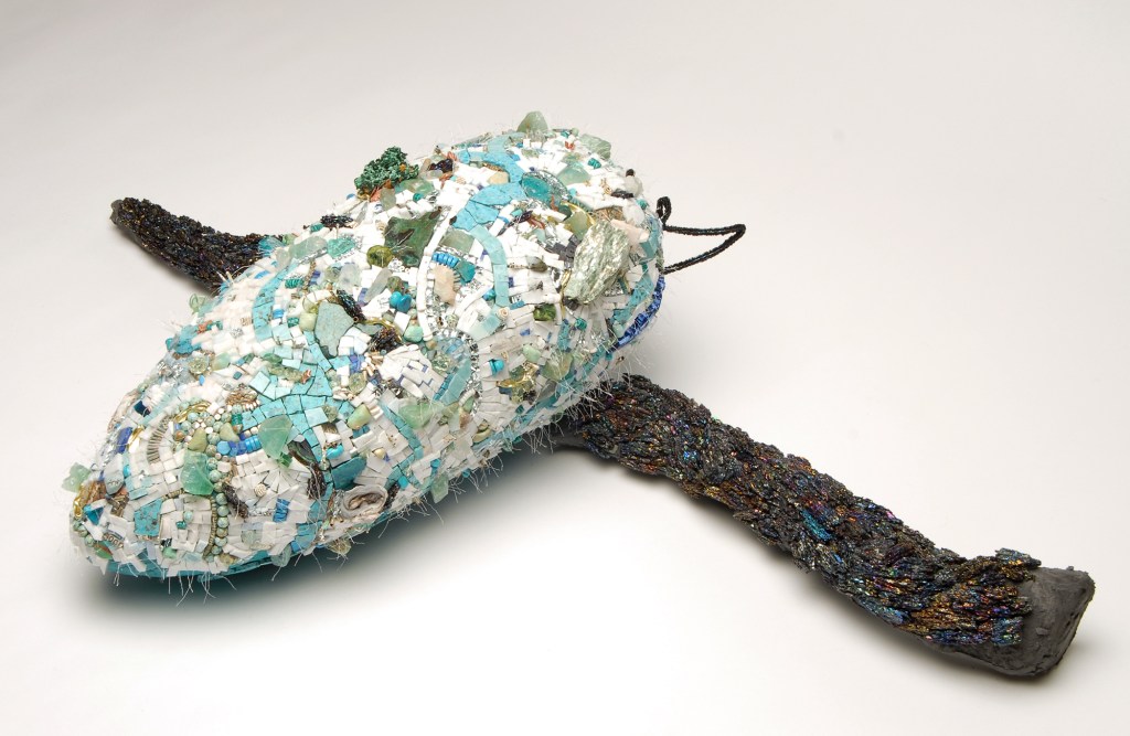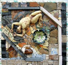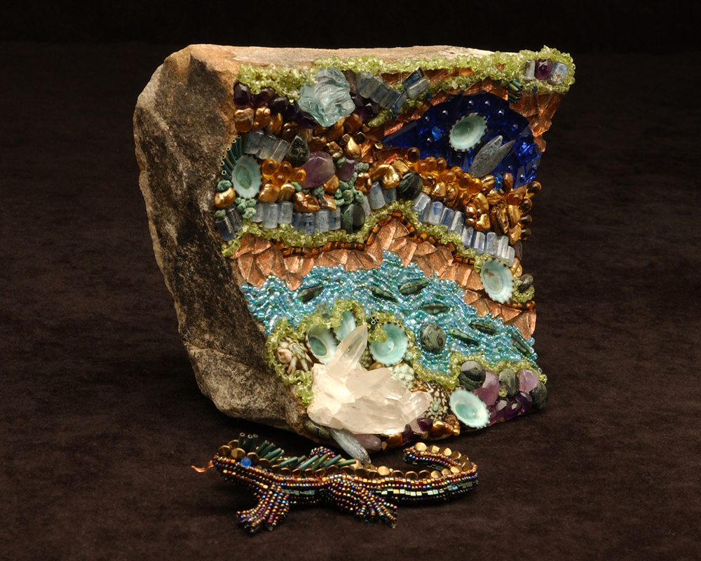 Late Bloomer: AVAILABLE, 10″H x 36″L x 18″W; Selected by and displayed at the Society of American Mosaics 2010; Glass, Metal, Mineral, Shell, Beads, Carborundum, Wire, Hand-Carved Styrofoam base by me; Through art, I hope to capture and momentarily magnify archetypal awakenings that resonate with the human spirit. I’m drawn to create with mixed materials because I want, above all, to create as full an image as I can manage. Late Bloomer pulls from the miscellanea of life — sometimes messy, sometimes arbitrary, always fascinating, always more cluttered than we had imagined. The pruning and fitting together of disparate materials becomes a way to order my own thoughts, emotions, and priorities, allowing the finished piece to serve as a kind of talisman.