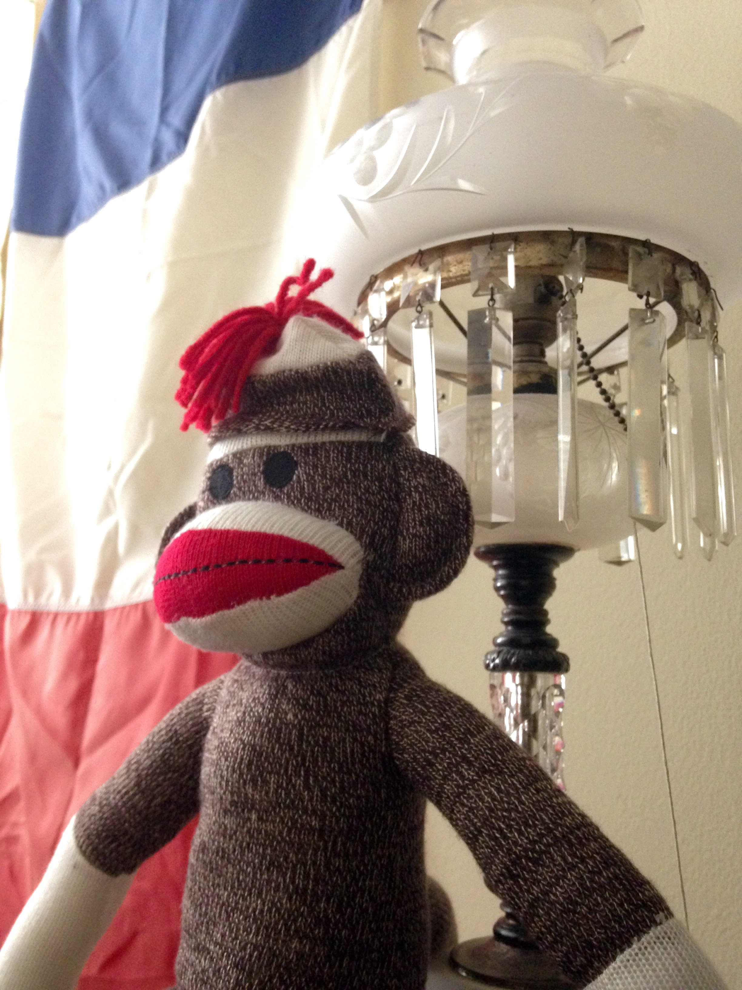 If he could see beyond the blue and white comforter folded over the footboard, he could look beyond to the grinning cherry-lipped sock monkey sitting on the desk, and behind him the full-size French flag pinned to the wall. The flag is new. Not new but newer, and still the red edges which hang toward the floor are a fringed jubilee of red threads from so many summers high atop the rafter at the peak of the beach house, burnished by the sun and whipped into a Marseillaise frenzy by seabreezes and Northeasters and summer suns. Our older version, which we still have, split into thirds at the color joins one winter, the white section ripped completely apart. My father sewed a white pillowcase between the blue and the red and ran it right back up the pole, undeterred, until one of us gifted him the new version, which was perhaps less fitting but rather more socially acceptable among some of the less imaginative locals.